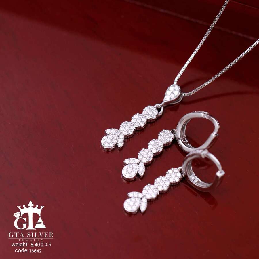 نیم ست نقره مدل میکرو همراه با روکش آبطلای سفید؛ عیار 925، تمامی نگین های این نیم ست جدید، ظریف با روش جدید میکروستینگ مخراج کاری شده