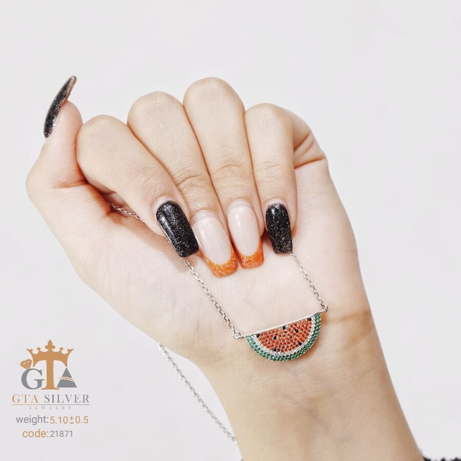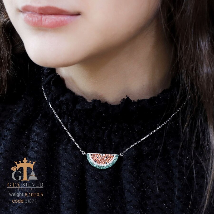 مدال نقره میکرو طرح هندوانه همراه با زنجیر , کاری بسیار ظریف و زیبا که نگین هایش با روش میکروستینگ مخراج کاری شده و دارای روکش آبطلای سفید می باشد. عیار این کار مانند تمامی کار های موجود, عیار استاندارد 925 می باشد.